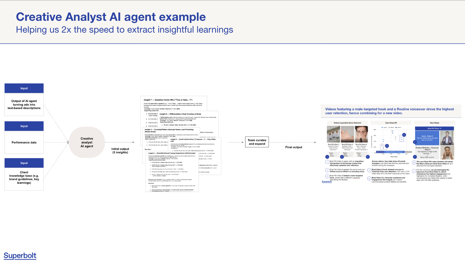 It produces an initial set of prioritized insights and hypotheses about what is driving performance. The team then validates, edits and expands those insights into actionable recommendations and briefs, as shown in the analysis workflow. This cuts the time to get from “data” to “clear creative direction” roughly in half
