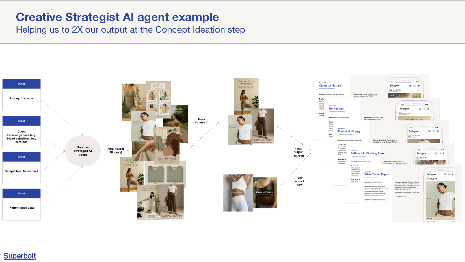 From this, it generates a first batch of concept territories, hooks and visual directions. As illustrated in our internal workflow, the agent produces an initial large set of ideas which the team then curates, refines and expands into final concepts ready for production. That alone roughly doubles output at the ideation step.